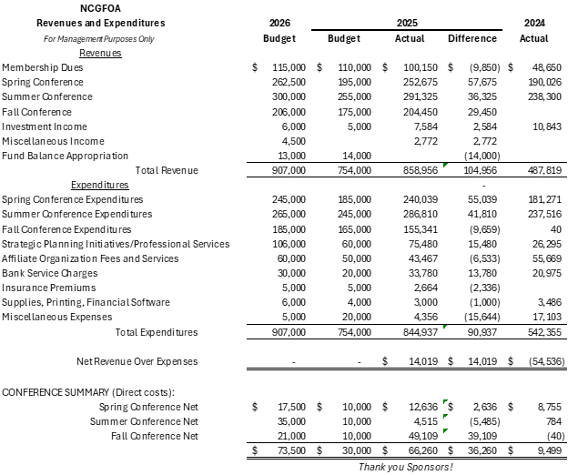 Looking ahead, the committee is exploring a variety of creative and engaging options for the 2026 Summer Conference to complement our new golf tournament traditions. In addition, the committee will review member feedback on this new newsletter, the NCGFOA Fiscal Beacon, to support continuous improvement and ensure ongoing value to the membership.